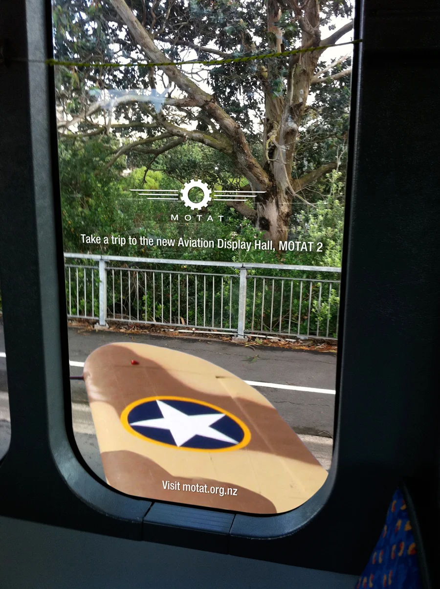 A cost-effective window and back-of-seat decal to announce the opening of the new Aviation Hall at MOTAT.